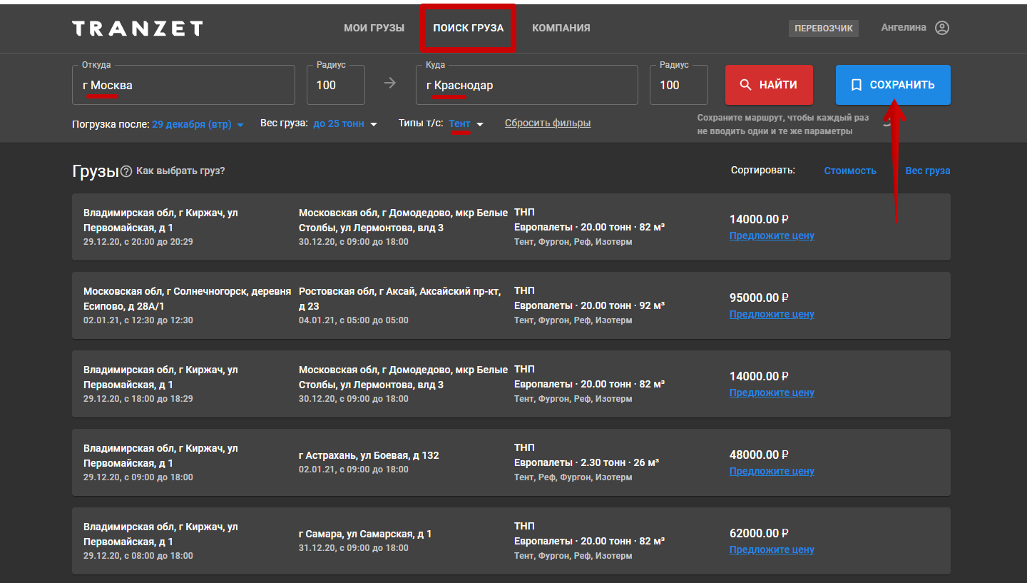 Чтобы добавить маршрут, введите город погрузки и выгрузки, тип транспорта и нажмите на синюю кнопку справа «Сохранить».