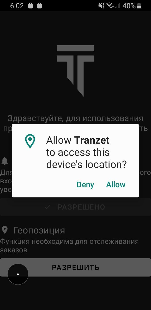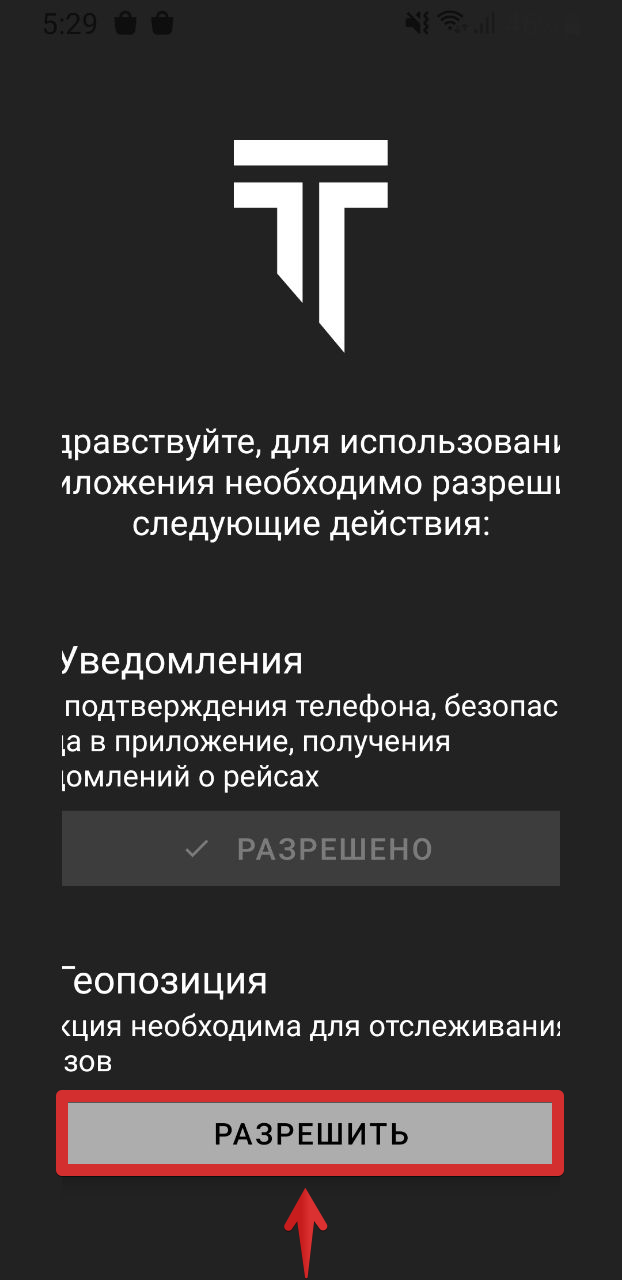 8. Нажмите на кнопку «Разрешить» в блоке «Геопозиция». Функция необходима для отслеживания заказов.